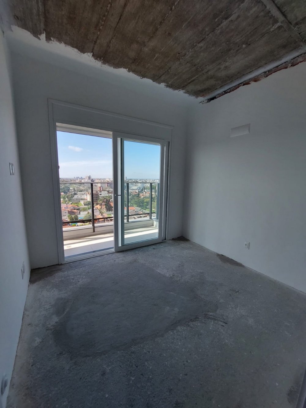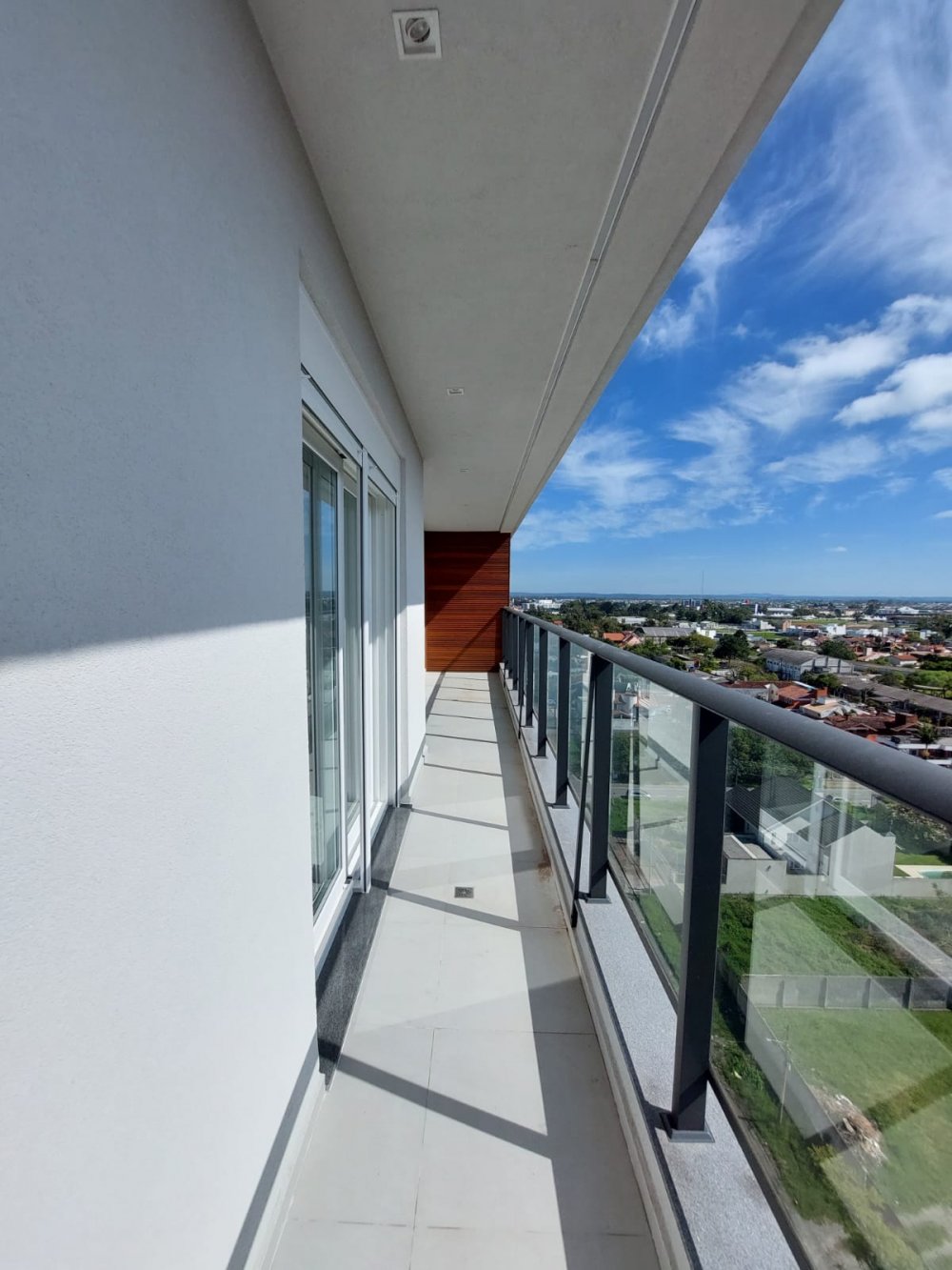 Sacada com piso porcelanato e teto em madeira