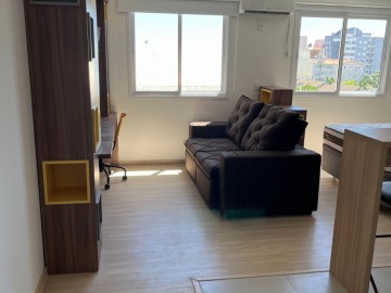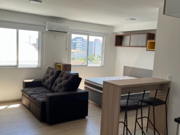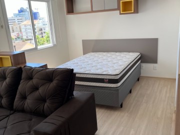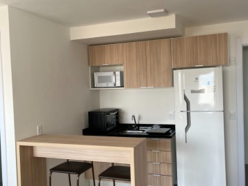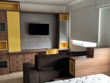 Mobiliado, a kitnet conta com móveis planejados de ótima qualidade, eletrodomésticos essenciais (fogão por indução, forno elétrico, micro-ondas e geladeira), cama de casal e TV