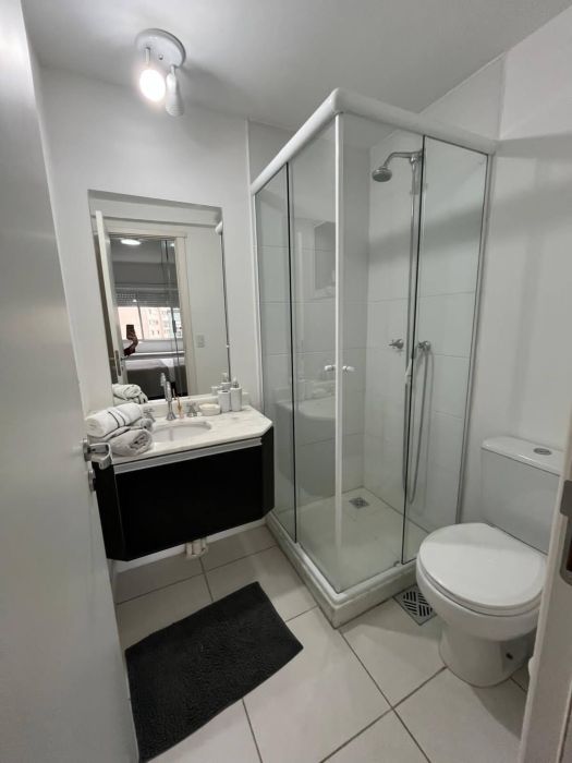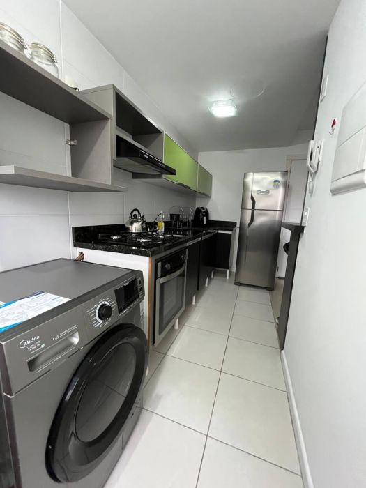 A cozinha está plenamente equipada com eletrodomésticos essenciais, incluindo fogão, geladeira, micro-ondas e máquina de lavar e secadora de roupas, além de utensílios completos. A disponibilidade de internet reforçam o caráter de conveniência e modernidade da unidade.