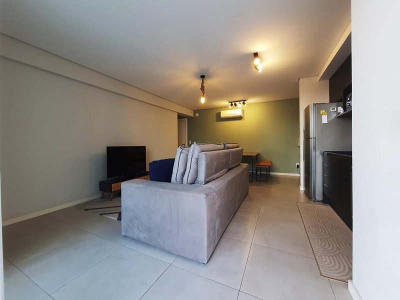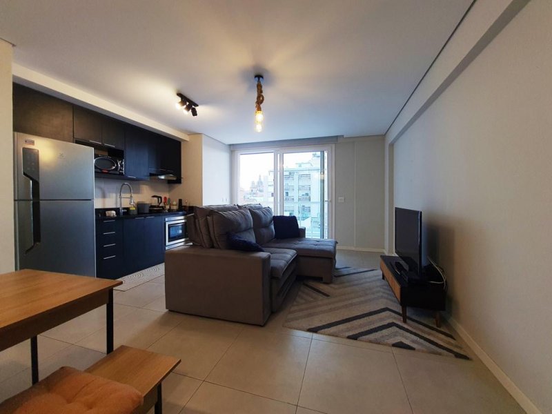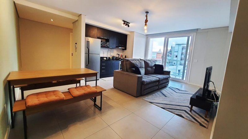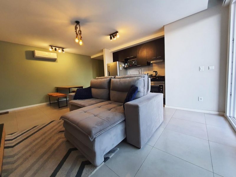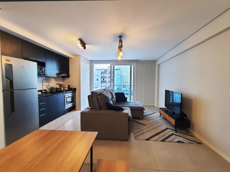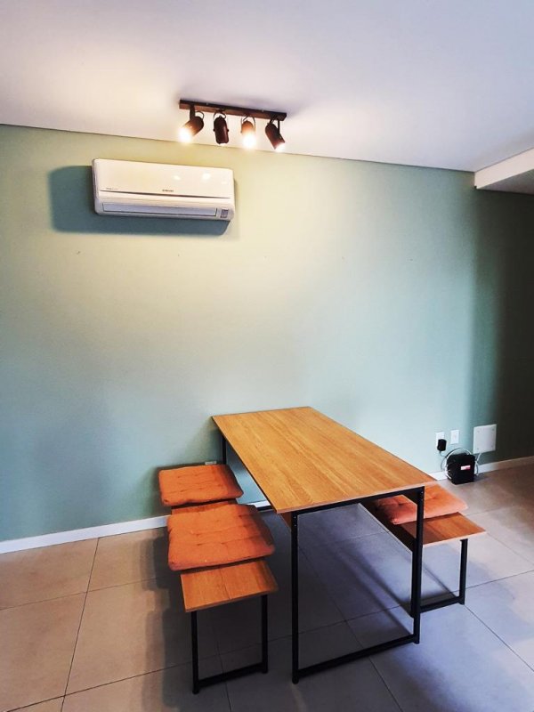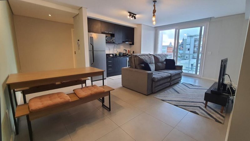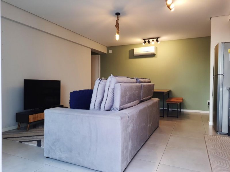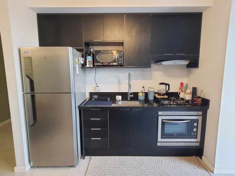 STÚDIO RESIDENCE PLUS - Apartamento de 2 dormitórios, sacada com churrasqueira, banheiro, cozinha, sala estar e jantar. Todo MOBILIADO, ficam os móveis planejados da cozinha, dormitório e escritório, geladeira, Junker, 02 ar condicionados, máquina de lavar, sofá retrátil, conjunto mesa de jantar com 2 bancos estilo industrial active yescasa nogal, rack de TV, forno microondas, forno elétrico, torneira Gourmet, depurador de ar Suggar, fogão cooktop.